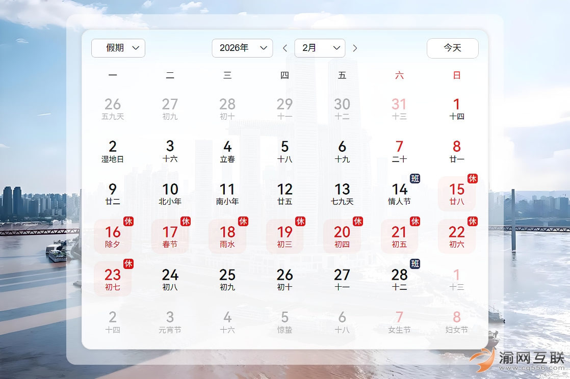 2月15日(農(nóng)歷臘月二十八、周日)至23日(農(nóng)歷正月初七、周一)放假調休,共9天。2月14日(周六)、2月28日(周六)上班。